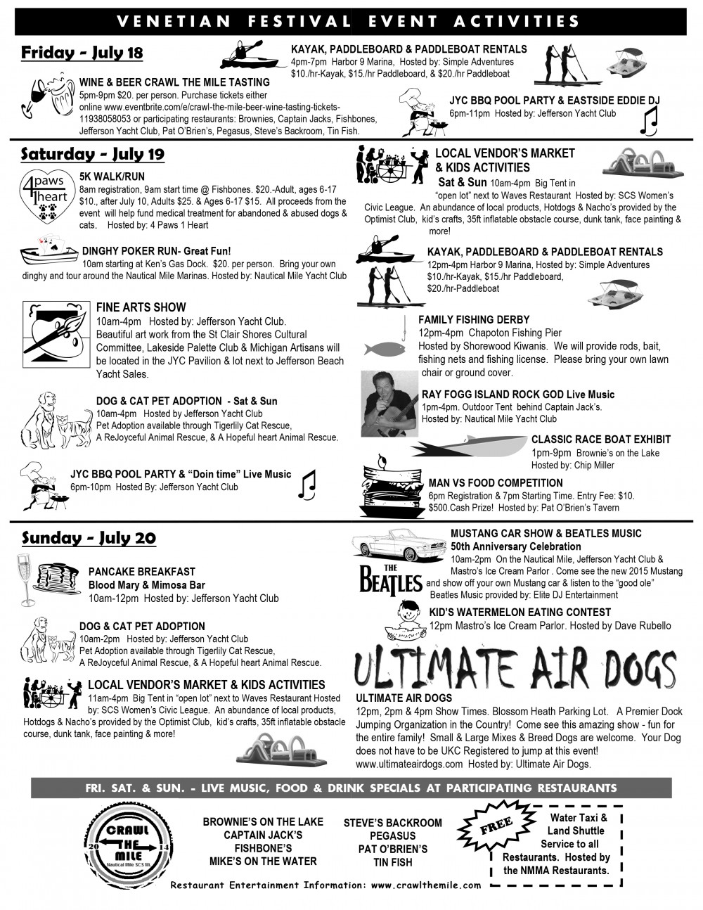 The St. Clair Shores Venetian Festival on the Nautical Mile is offering a wide range of events for people of all ages. The Venetian Festival runs from Friday, July 18, 2014 to Sunday, July 20, 2014. All events will be located along the Nautical Mile in St. Clair Shores (Jefferson Avenue between 9 & 10 Mile Roads). NEW this year is the “Ultimate Air Dogs” event…a premier dock jumping organization- come see the amazing show on Sunday!